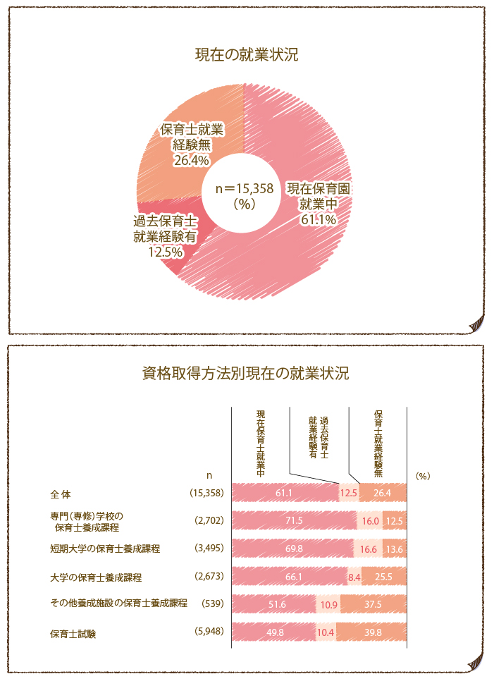厚生労働省「保育士試験の実施状況(平成30年度)」発表によると、保育士試験受験者数は、全国では約68,388人、合格者数は13,500人(全免除を除く)いることを明らかにしています。保育士を目指している方を全体的にみれば、保育士養成施設などで学んでいる学生や、未受験者の方も加えると相当な数になるでしょう。>これだけ多くの保育士志望の方がいるにも関わらず、東京都福祉保健局「平成30年度東京都保育士実態調査結果(報告書)」によると、保育士の資格を取得した後、保育士として就業した人の割合が全体の61.1%(現在保育士として就業中)で、過去に保育士を経験して現在は就業していない人が12.5%(就業経験有)、資格を取得していながら保育士として全く働いていない人が26.4%(就業経験無)もいることが分かりました。理由として、同調査の他の項目も見てみると、調査対象者の中には、小学校、中学校、高等学校の教諭や、介護福祉士、看護師などの資格を取得している人も一定数いましたので、結果として保育士の仕事を選択しなかったことが考えられます。しかし、保育士の資格を取得しても保育士として働かない方の中には、専門学校や大学の保育士養成課程を修了した新卒者なども含まれており、実際に働いてもいない段階から保育士を断念してしまった方が約10~30%もいることが分かりました。この結果をみる限り、向き不向きを自己判断しているのではないかとも推定ができます。