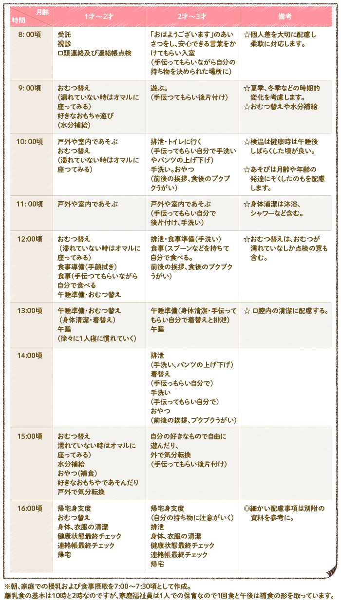 お昼寝(午睡) おむつ交換・トイレを済ませてから寝付くまで絵本の読み聞かせなどをします。寝ている間はSIDSや窒息を予防するため定期的に呼吸確認。 |