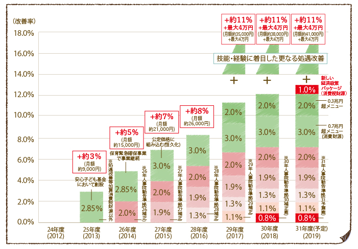 平成25年の「処遇改善等加算」の導入から現在までの過去7年間の推移を確認してみると、処遇改善は平成25年で約3%(月額約9,000円)であったものが、平成31年・令和元年では約13%(月額約41,000円)まで増加したことがわかります。そして、今年の処遇改善のトピックとしては、保育士の収入面においては大きな恩恵は受けませんが、10月増税の財源を活用した新しい経済政策パッケージが挙げられるでしょう。なお、平成25年度から現在までの保育士等の処遇改善の推移については、図表1も併せてご確認ください。