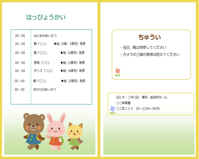 発表会の日程を含む、進行や計画表を作ります。基本的なプログラム内容は「開会・年齢/クラス別の演目・閉会」となり、保育園によっては写真撮影の時間や年長の子どもがナレーションや司会のアナウンスを行うこともあるため応じて付け加えましょう。また、プログラムに日時や場所などの基本的な情報と保護者向けの持ち物、注意事項を記載します。注意事項にはあらかじめトラブルになりそうなことを、ルールとして記載するととても効果的です。
