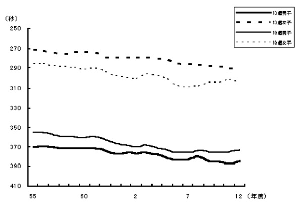 昭和60年以降の調査結果について、具体的に見ると、持久走(男子1,500m、女子1,000m)では、例えば、13歳女子は、昭和60年を最高に平成12年では25秒以上遅くなっている(図1-1)。