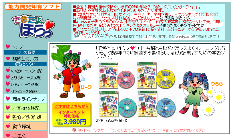 知育ソフトです。「どきどきどりる」、「わくわくわーく」、「げーむ」、「あしあと」、で構成されています。まだまだ幼児向け教材では紙ベースのものが多い中、PCを使って楽しみながら様々な学びを提供しています。子供が飽きず、内容も充実しているとあって、今人気の教材です。
