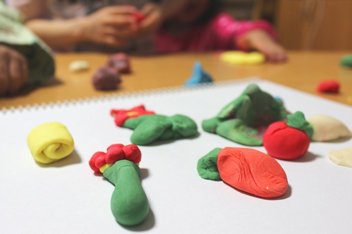 粘土で何かを造形することで、「自分で考えて作る」という創造力が養われ、紙粘土や油粘土、または小麦粘土というように色々な種類の粘土を取り入れることで手で触った感触や質感、叩きつける音や力加減、粘土の種類によっての匂いなどで五感を刺激し脳の発達にも良いとされています。