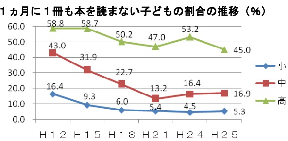 グラフを見ていただくと一目瞭然ですが、1ヶ月に本を一冊も読まない子供の割合は減少傾向にはあるものの、まだまだ多くいることがわかります。