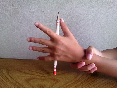 左手をゆっくり開くと、、、鉛筆がくっついていて落ちません(こっそり、右手の人差し指で鉛筆を押さえておきます)。
