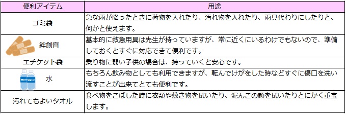 その他、持っておくときっと役立つアイテムを表にまとめました。